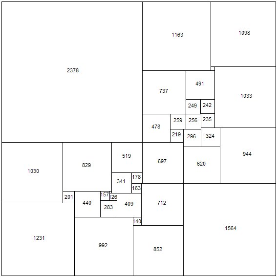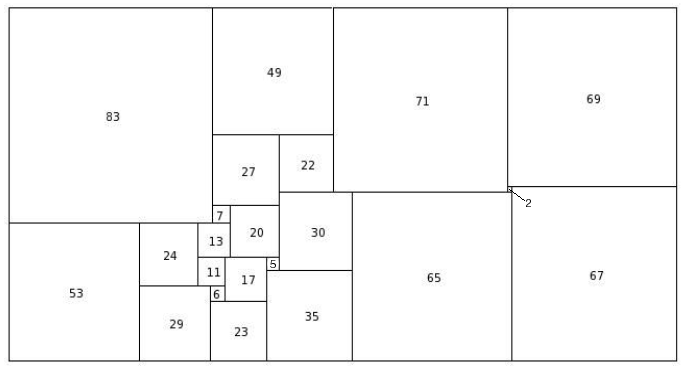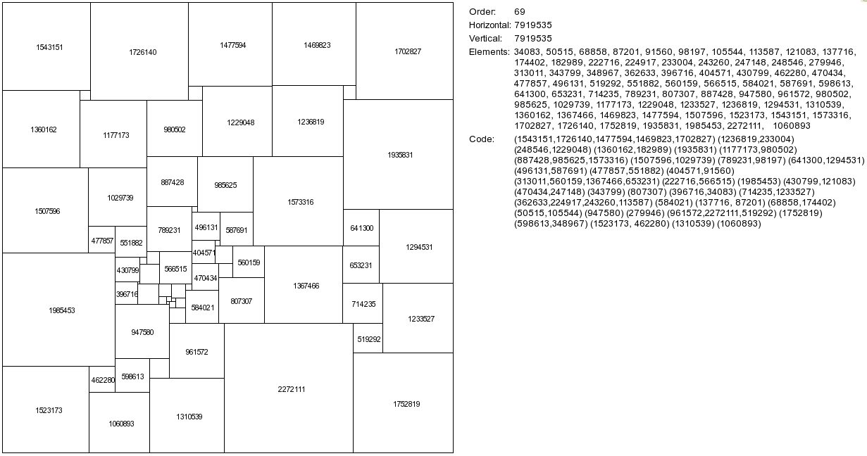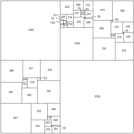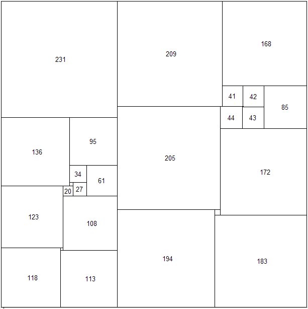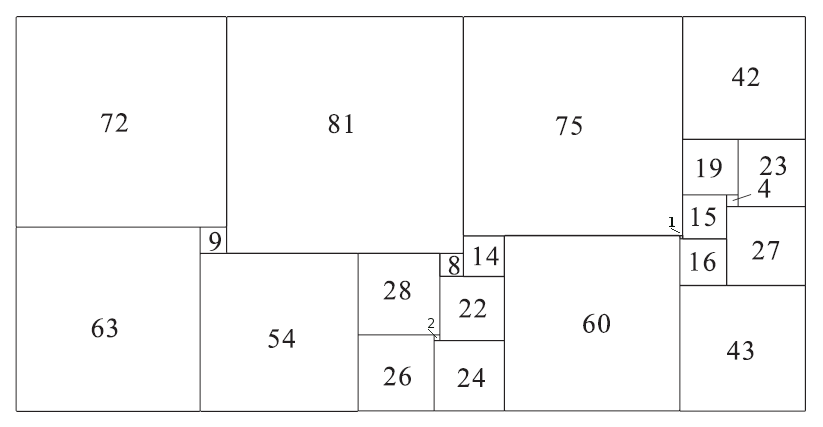 Other researchers have used the empirical method with spectacular results. R. Sprague of Berlin fitted a number of perfect rectangles together in a most ingenious way to produce a perfect square of the 55th order. This was the first perfect square to be published (1939). More recently T.H. Willcocks of Bristol, who did not confine his catalogue to simple and perfect squared rectangles, obtained a perfect square of the 24th order (Figure 83). Its formula is as follows: (55,39,81) (16,9,14) (4,5) (3,1) (20) (56,1) (38) (30,51) (64,31,29) (8,43) (2,35) (33). This perfect square still holds the low-order record. [Perfect Compound Square record, see footnote 1.]
