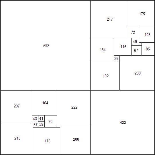 In this formula each pair of brackets represents one of the horizontal segments in the subdivision pattern of the perfect square. These segments are taken in vertical order, beginning with the upper horizontal side of the square, and the lower horizontal side is omitted. the numbers enclosed by a pair of brackets are the sides of those component squares which have their upper horizontal sides in the corresponding segment. They are taken in order from left to right. The reduced side of the perfect square is the sum of the numbers in the first pair of brackets, that is 4,639.