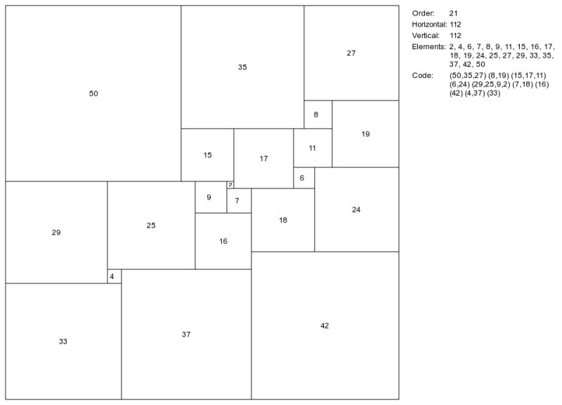 In case any reader should like to do some work on perfect rectangles himself, here are two unsolved problems. The first is to determine the smallest possible order for a perfect square [solved, see footnote 2.]. The second is to find a simple perfect rectangle whose horizontal side is twice the vertical side. [solved, see footnote 3.]